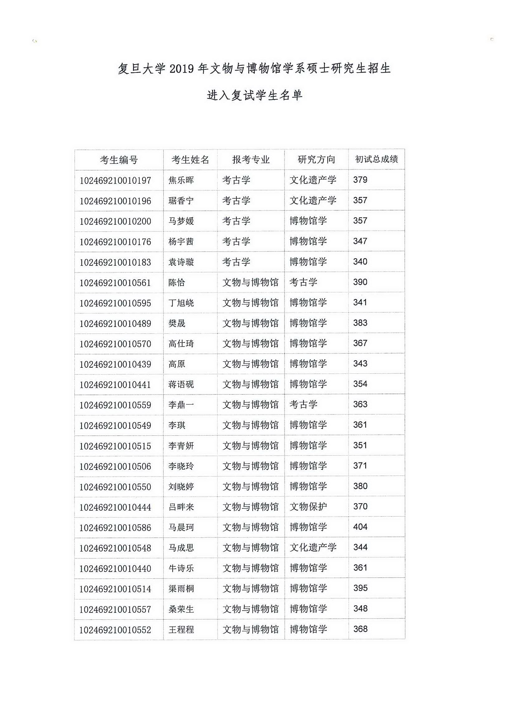 据悉,复旦大学文博系2019年硕士研究生招生进入复试学生名单已公布,聚创复旦大学考研网小编收集整理如下: