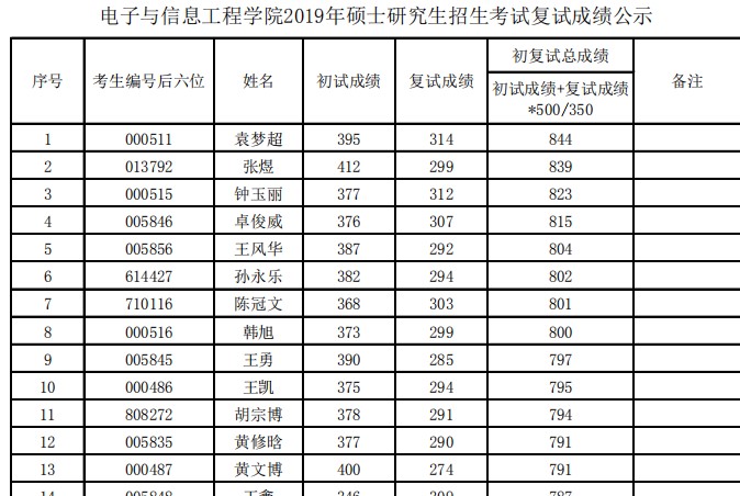 附件:电子与信息工程学院2019年硕士研究生招生考试复试成绩公示