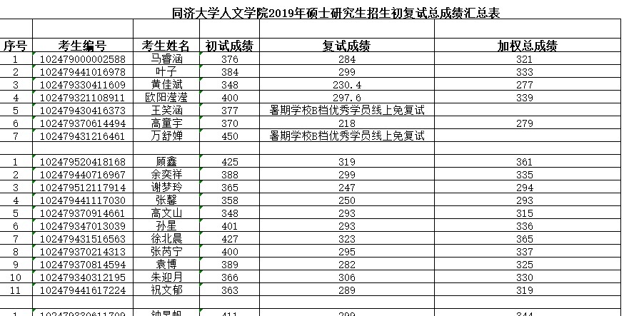以上是聚创考研网为考生整理的"2019年同济大学人文学院硕士研究生招生复试加权总成绩公示名单"的相关考研信息,希望对大家考研备考有所帮助!