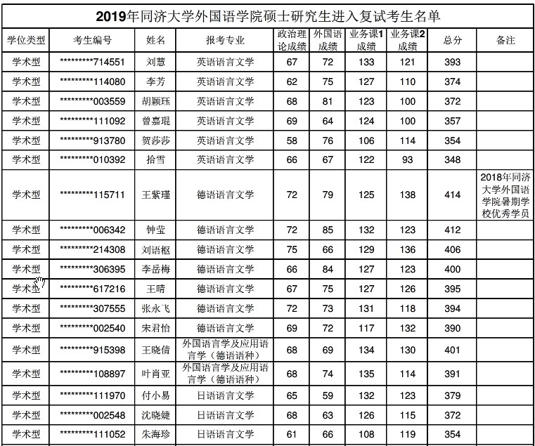 附件:2019年同济大学外国语学院硕士研究生进入复试考生名单