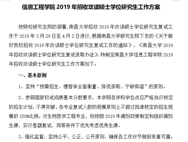 以上是聚创考研网为考生整理的"南昌大学2019年信息工程学院研究生招收攻读硕士学位复试工作方案"的相关考研信息,希望对大家考研备考有所帮助! 备考过程中如有疑问,也可以添加老师微信juchuang911进行咨询。