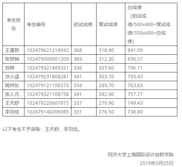 据悉,2019年同济大学设计创意学院硕士研究生复试结果公告已公布,聚创同济大学考研网小编为大家整理了相关信息,具体内容如下: