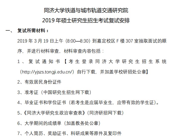 附件:同济大学铁道与城市轨道交通研究院2019年硕士研究生招生考试复试安排