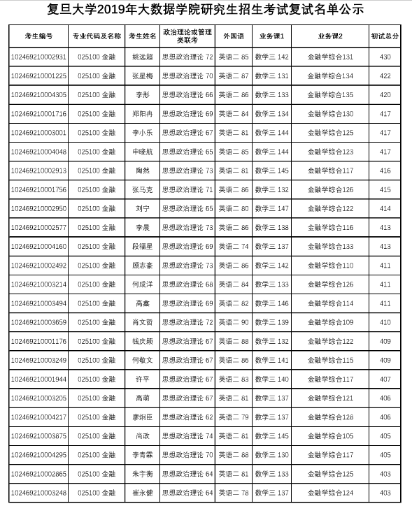 据悉,复旦大学大数据学院2019年研究生招生考试复试名单已公布,聚创复旦大学考研网小编收集整理如下: