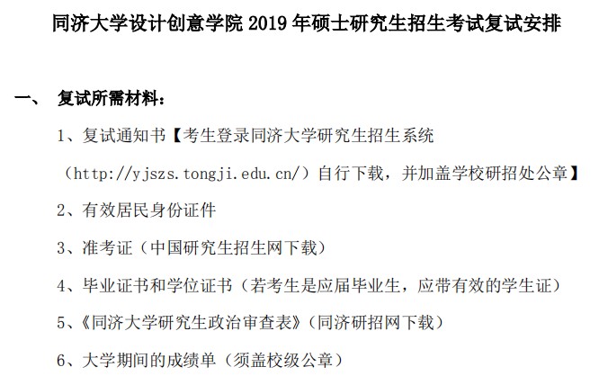 以上是聚创考研网为考生整理的"同济大学设计创意学院2019年硕士研究生招生考试复试安排"的相关考研信息,希望对大家考研备考有所帮助!