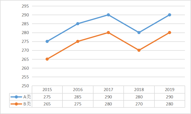 2015-2019年理学总分国家线趋势图及单科复试分数