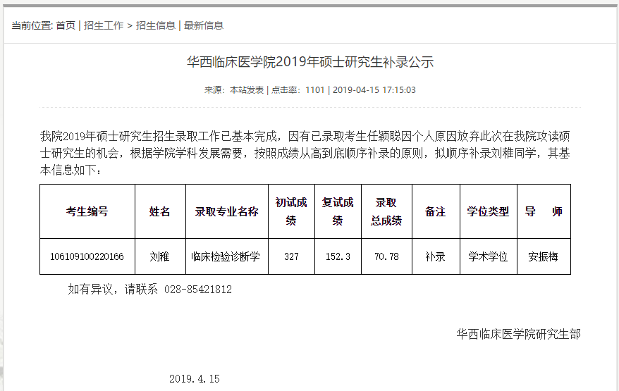据悉,四川大学临床医学院2019年硕士研究生补录公示已公布,聚创四川大学考研网小编为大家整理如下: