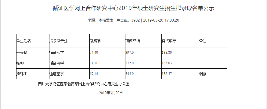 以上是聚创考研网为考生整理的"四川大学循证医学网上合作研究中心2019年硕士研究生招生拟录取名单公示"的相关考研信息,希望对大家考研备考有所帮助!