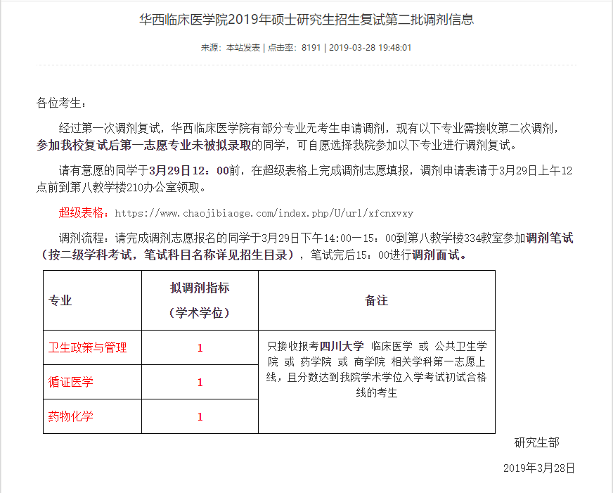 以上是聚创考研网为考生整理的"四川大学华西临床医学院2019年硕士研究生招生复试第二批调剂信息"的相关考研信息,希望对大家考研备考有所帮助!
