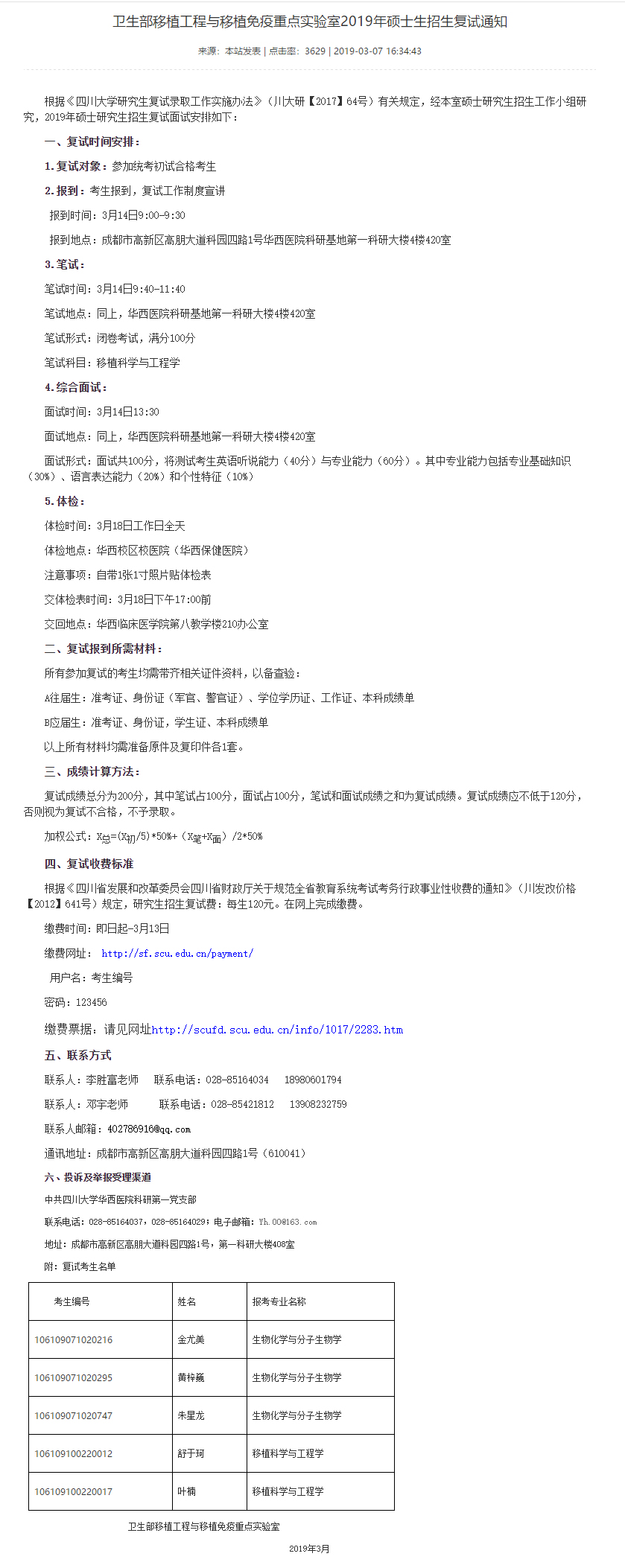 据悉,四川大学卫生部移植工程与移植免疫重点实验室2019年硕士生招生复试通知目前已公布,聚创四川大学考研网小编为大家整理如下: