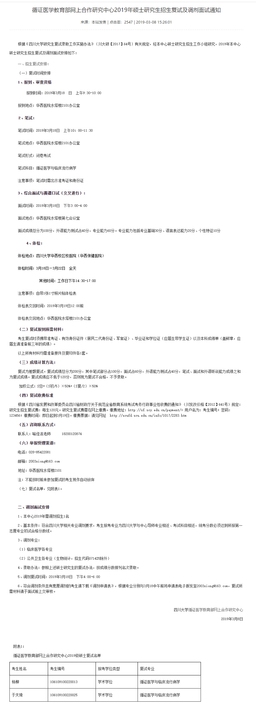 据悉,四川大学循证医学教育部网上合作研究中心2019年硕士研究生招生复试及调剂面试通知目前已公布,聚创四川大学考研网小编为大家整理如下: