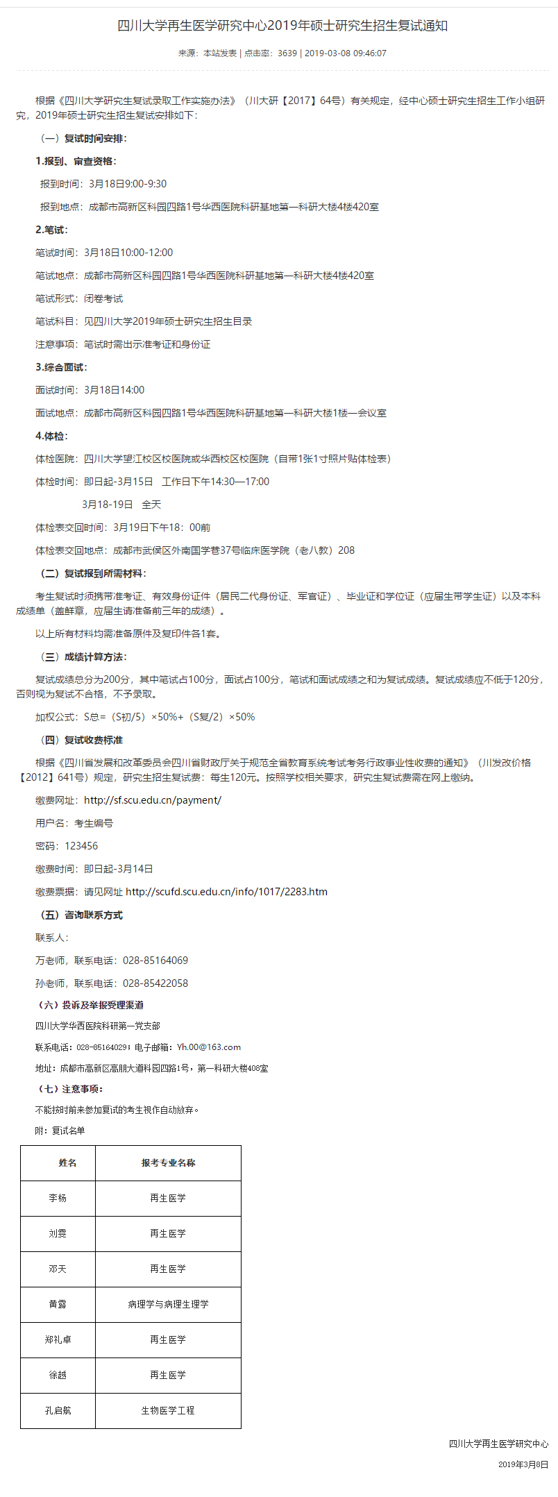 据悉,四川大学再生医学研究中心2019年硕士研究生招生复试通知目前已公布,聚创四川大学考研网小编为大家整理如下: