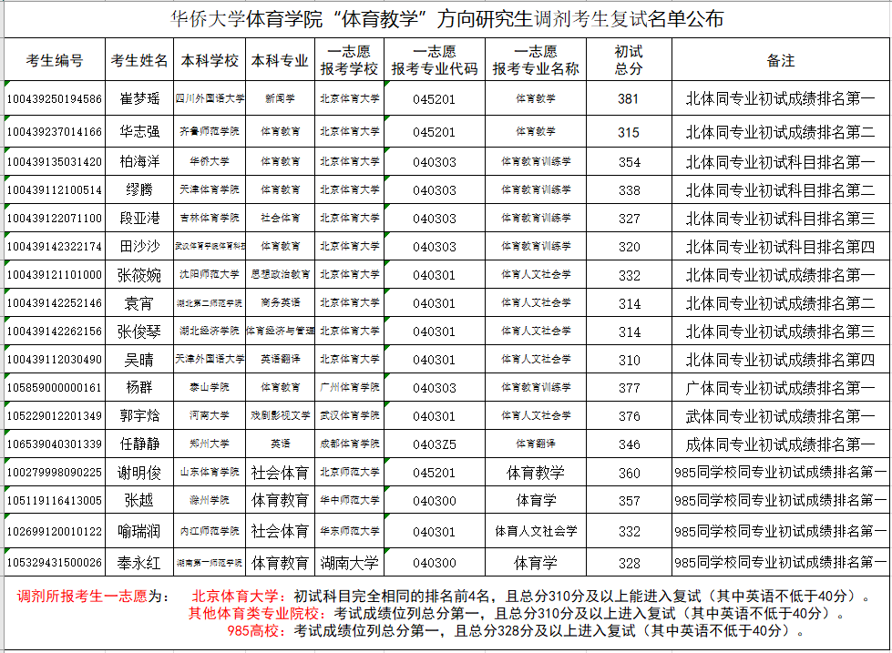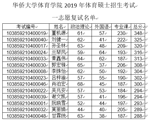 据悉,华侨大学体育学院2019年研究生复试名单公布已公布,聚创华侨大学考研网小编为你整理如下内容:
