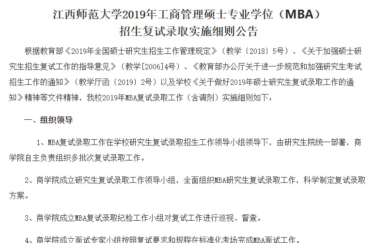 以上是聚创考研网为考生整理的"江西师范大学商学院研招公告3号2019年MBA招生复试录取实施细则"的相关考研信息,希望对大家考研备考有所帮助! 备考过程中如有疑问,也可以添加老师微信juchuang911进行咨询。