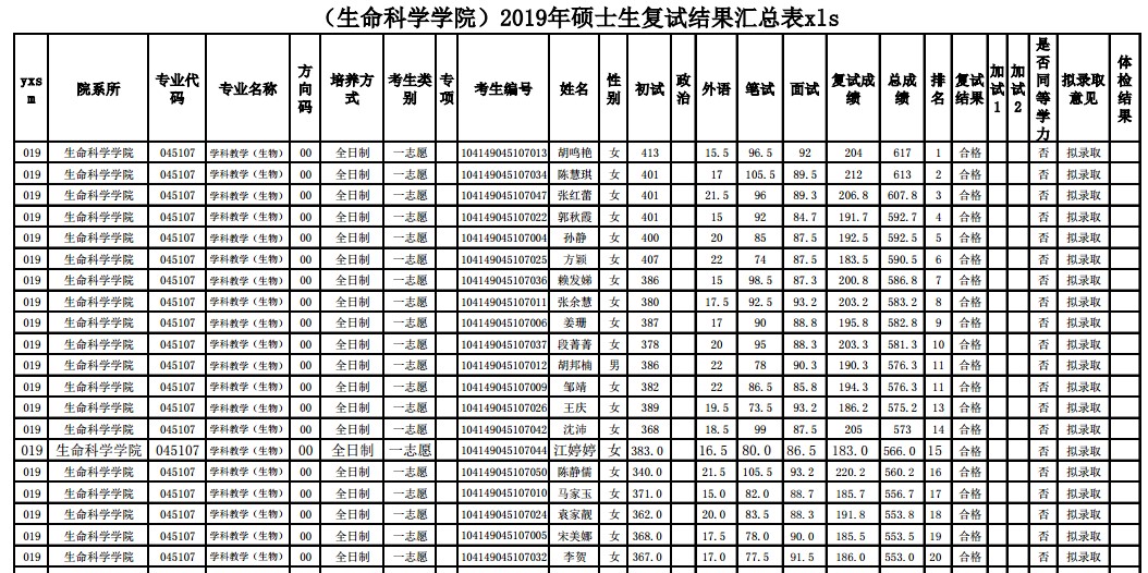 附件:生命科学学院2019年硕士研究生招生复试结果
