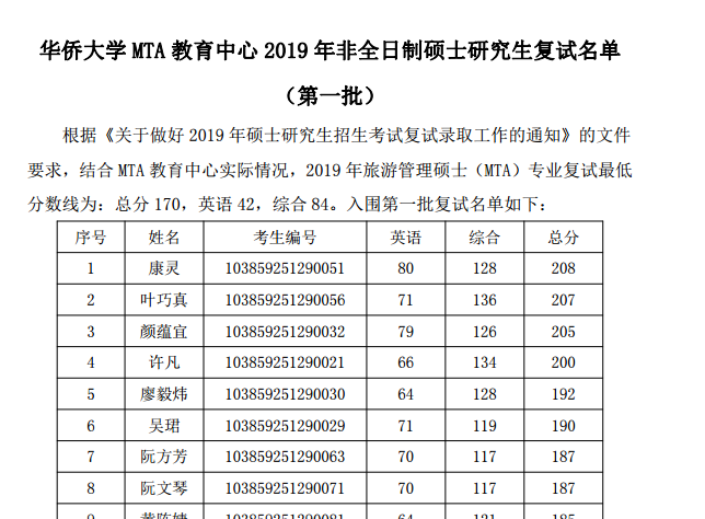 完成版名单查看附件:华侨大学MTA教育中心2019年非全日制硕士研究生复试名单(第一批).pdf
