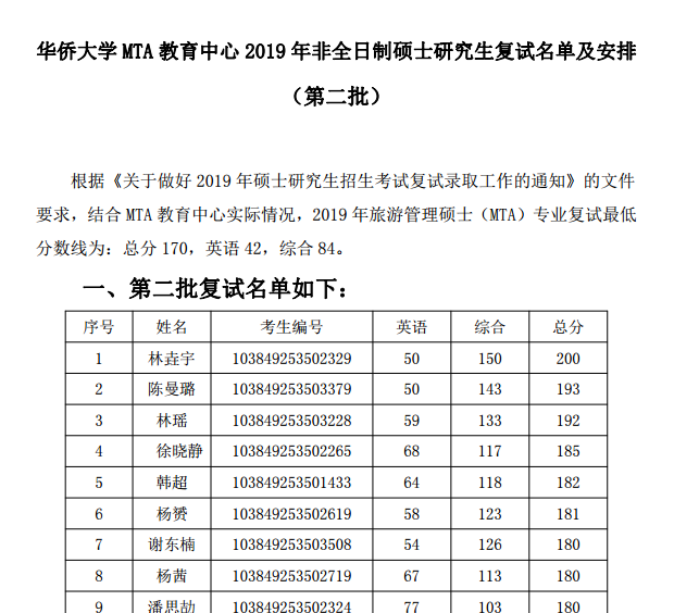 完成版名单查看附件:华侨大学MTA教育中心2019年非全日制硕士研究生复试名单及安排(第二批).pdf