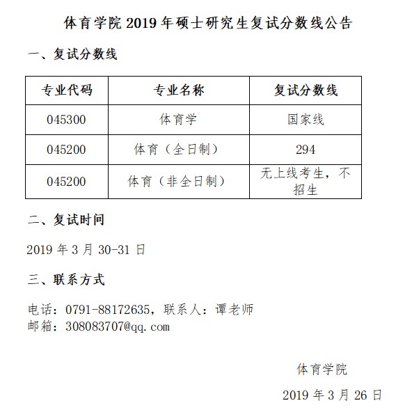 据悉,江西师范大学体育学院2019年硕士研究生复试分数线公告已公布,聚创江西师大考研网为您整理如下: