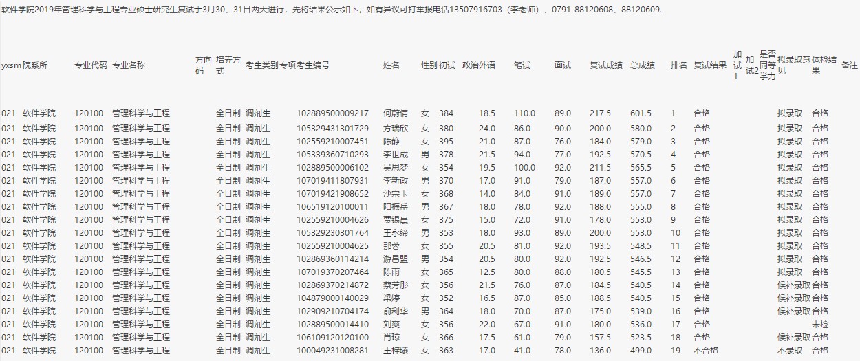据悉,江西师范大学软件学院2019年管理科学与工程专业硕士研究生复试结果公示已公布,聚创江西师大考研网为您整理如下: