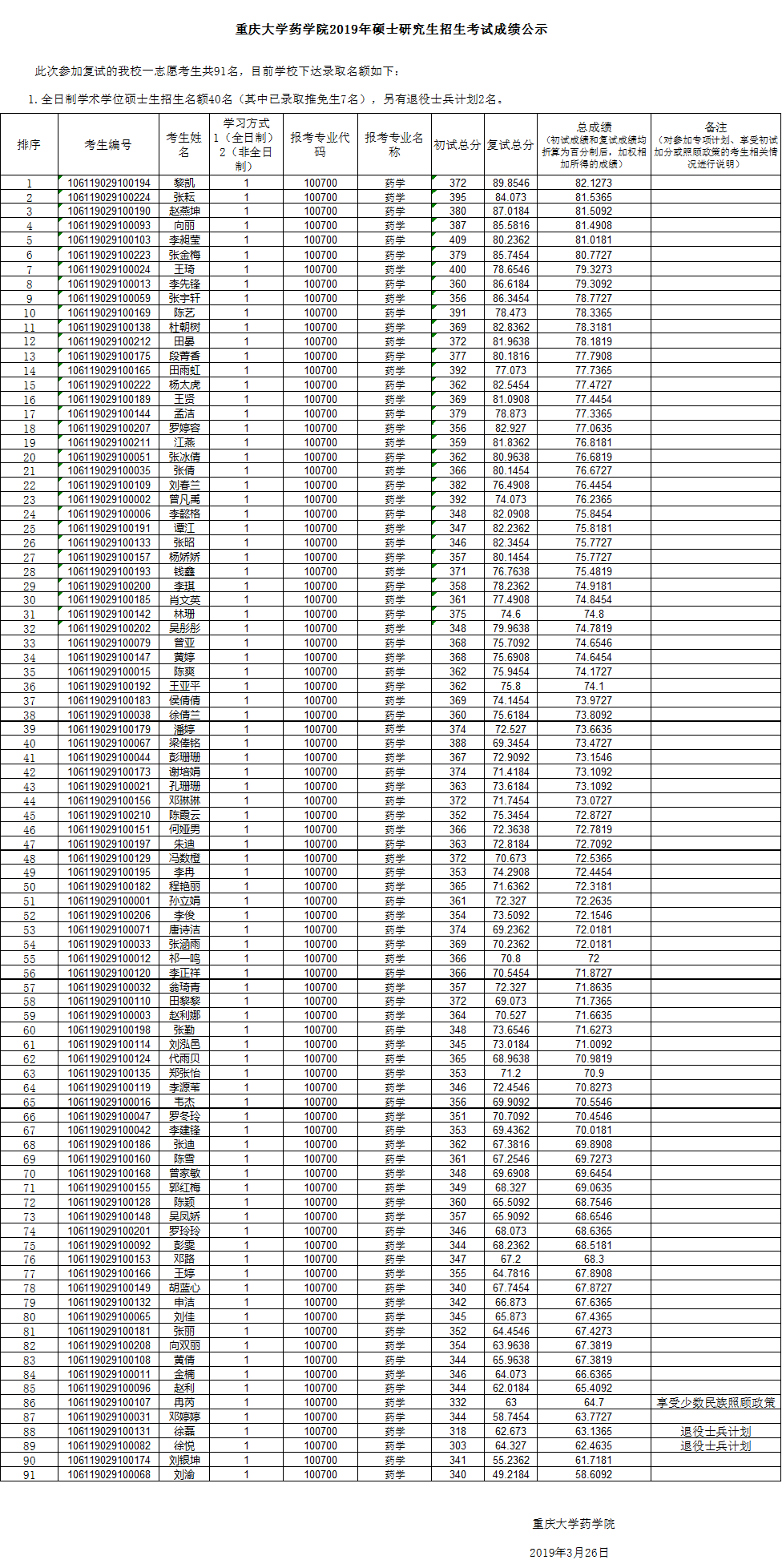 据悉,重庆大学药学院2019年硕士研究生招生考试成绩已公布,聚创重庆大学考研网为大家整理如下:
