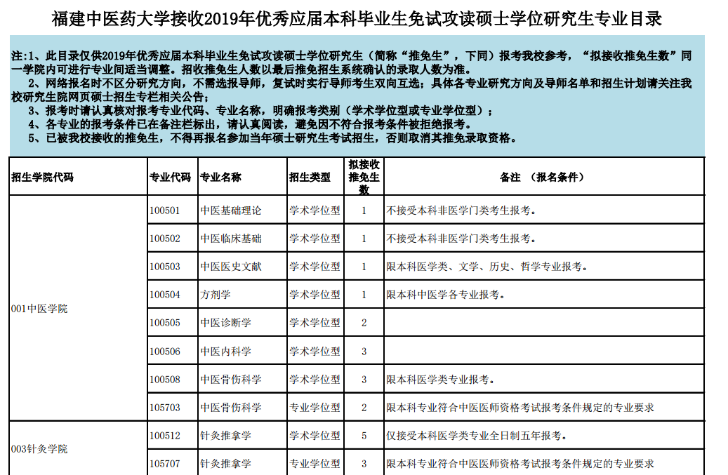 据悉,福建中医药大学2019年接收推免生招生专业目录已公布,聚创福建中医药大学考研网汇总如下: