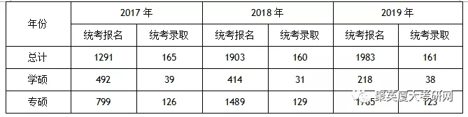 2)专硕的整体录取人数也没有大的波动,维持在120-130这个区间。但是,2019年的报考人数是2017年的两倍还多