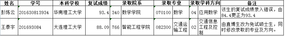我校2020年拟录取免试研究生中,有2人的录取信息变更,具体信息如下: