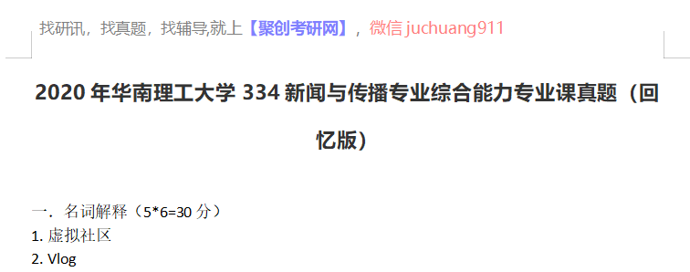 以上是聚创考研网为考生整理的"2020年华南理工大学334新闻与传播专业综合能力专业课真题(回忆版)"的相关考研信息,希望对大家考研备考有所帮助! 备考过程中如有疑问,也可以添加老师微信juchuang911进行咨询。