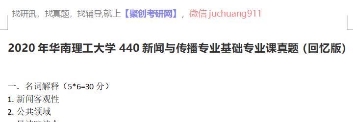 以上是聚创考研网为考生整理的"2020年华南理工大学440新闻与传播专业基础专业课考研真题(回忆版)"的相关考研信息,希望对大家考研备考有所帮助! 备考过程中如有疑问,也可以添加老师微信juchuang911进行咨询。