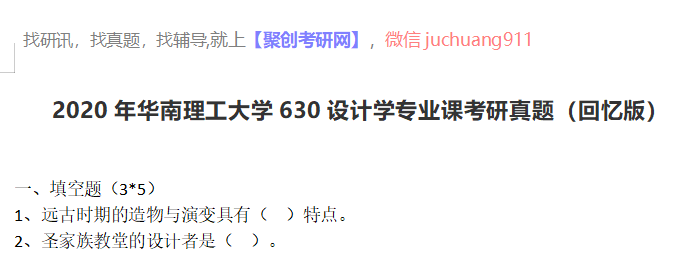 以上是聚创考研网为考生整理的"2020年华南理工大学630设计学专业课考研真题(回忆版)"的相关考研信息,希望对大家考研备考有所帮助! 备考过程中如有疑问,也可以添加老师微信juchuang911进行咨询。