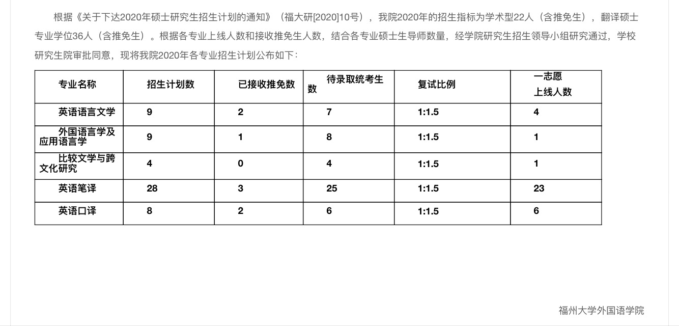 据悉,福州大学外国语学院2020年硕士研究生考试各专业招生计划已公布,聚创福州大学考研网小编为大家整理了相关信息