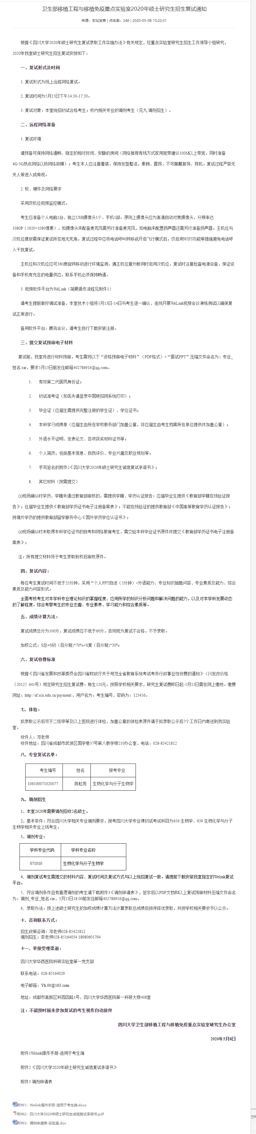 以上是聚创考研网为考生整理的"四川大学卫生部移植工程与移植免疫重点实验室2020年硕士研究生招生复试通知"的相关考研信息,希望对大家考研备考有所帮助!