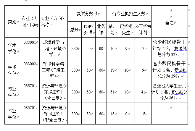 表1 中山大学环境科学与工程学院2020年硕士研究生复试分数线及各专业(方向)拟招生人数