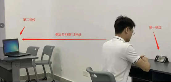 考生自行选择复试场所,要求环境相对安静、独立,光线明亮(不反光);可连接稳定电源,最好有备用电源;考生复试时需面向墙面(间隔不超过1米),可视范围内不能有任何复试相关参考资料,应试场所不能有他人在场。第二机位放置于考生侧后方45度1.5米处。参考环境如下: