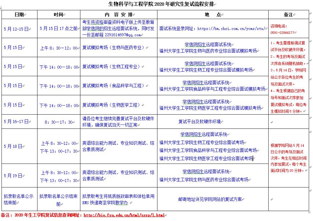 据悉,福州大学生物科学与工程学院2020年复试流程安排已公布,聚创福州大学考研网小编为大家整理了相关信息