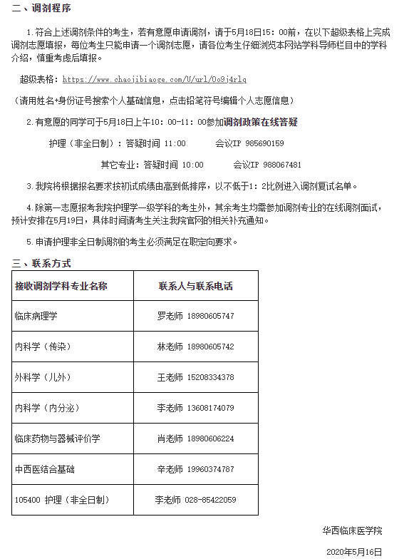 以上是聚创考研网为考生整理的"四川大学华西临床医学院2020年硕士研究生复试调剂信息"的相关考研信息,希望对大家考研备考有所帮助!