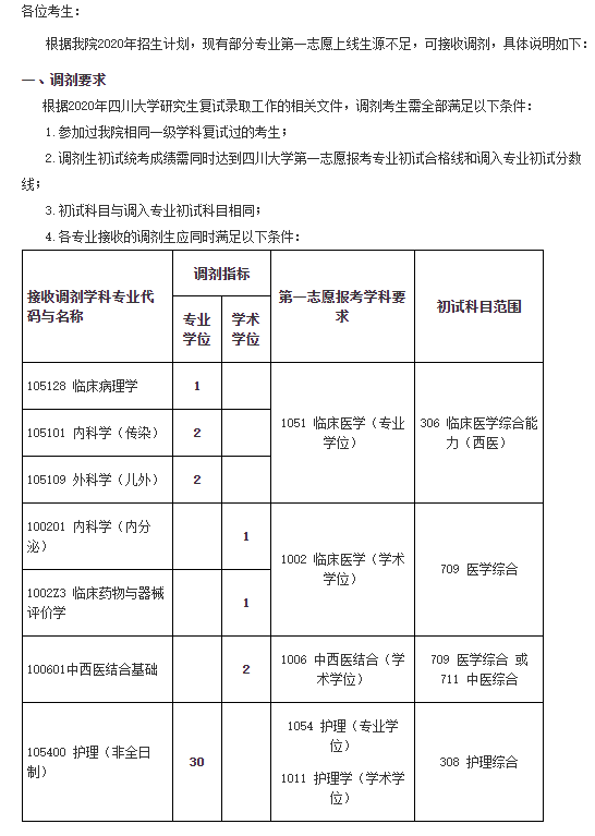 据悉,四川大学华西临床医学院2020年硕士研究生复试调剂信息目前已公布,聚创四川大学考研网小编为大家整理如下: