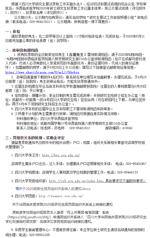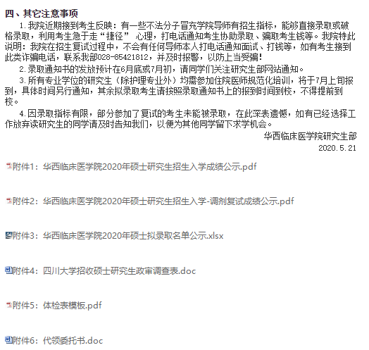 以上是聚创考研网为考生整理的"四川大学华西临床医学院2020年硕士研究生拟录取名单公示"的相关考研信息,希望对大家考研备考有所帮助! 备考过程中如有疑问,也可以添加老师微信juchuang911进行咨询。