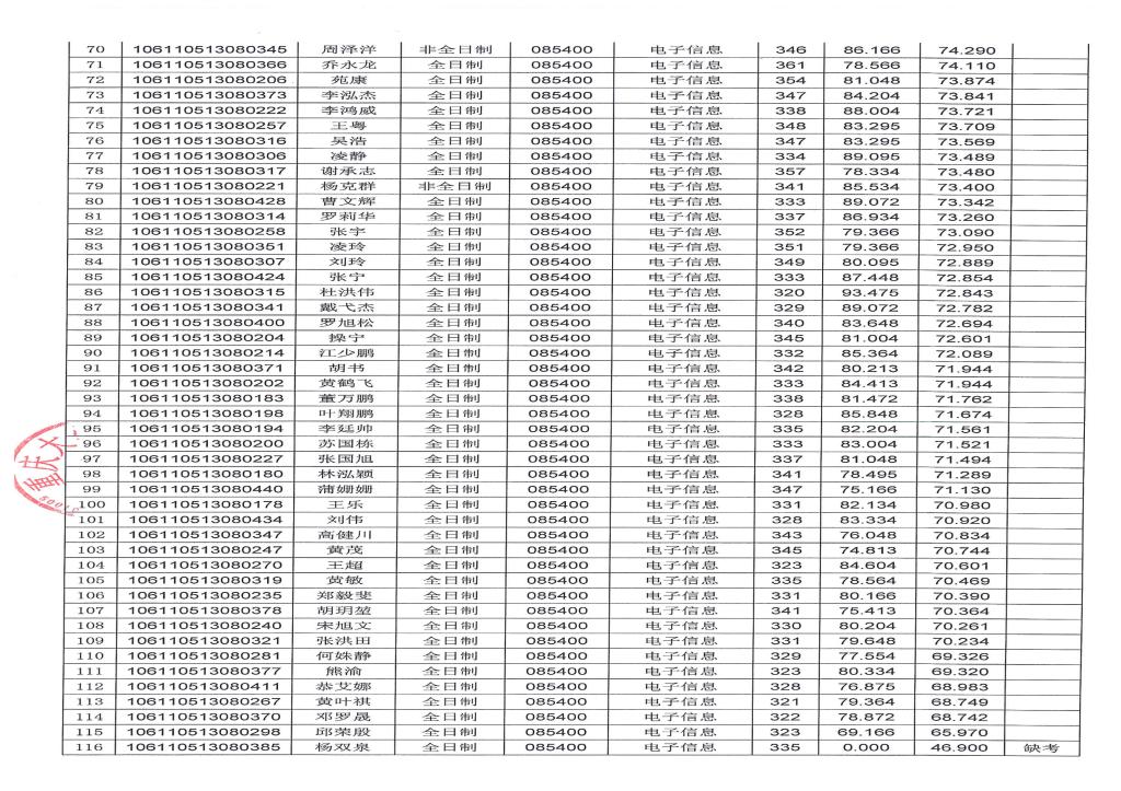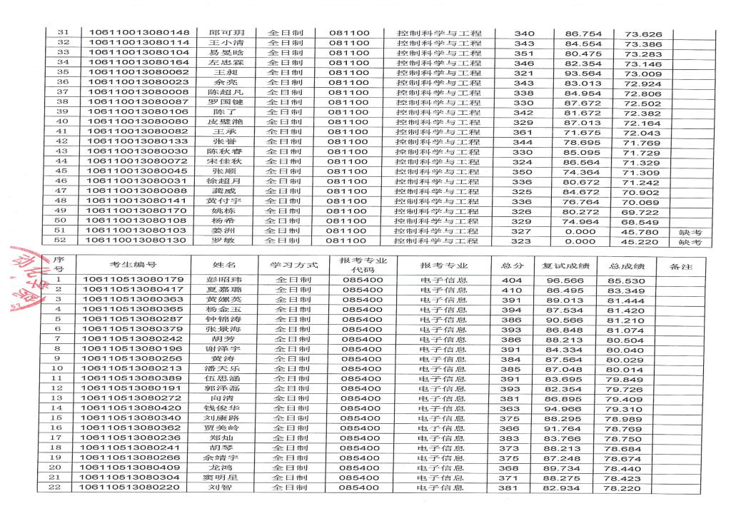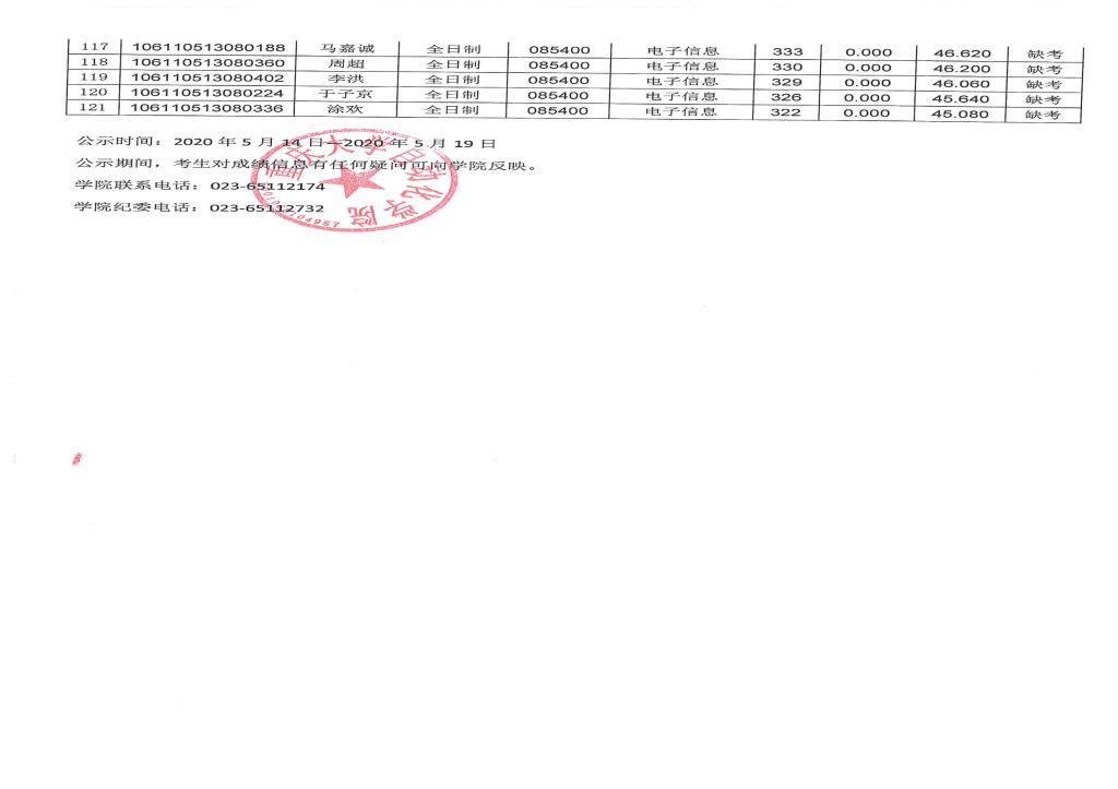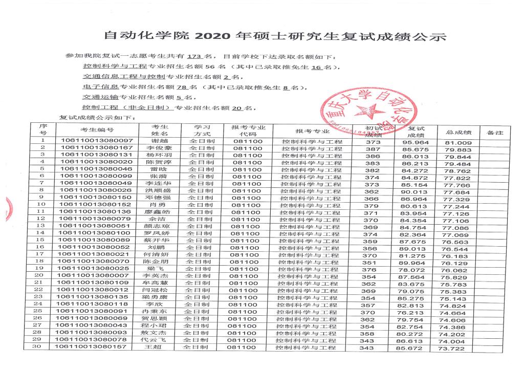 据悉,重庆大学自动化学院2020年硕士研究生复试成绩公示已公布,聚创重庆大学考研网为大家整理如下:
