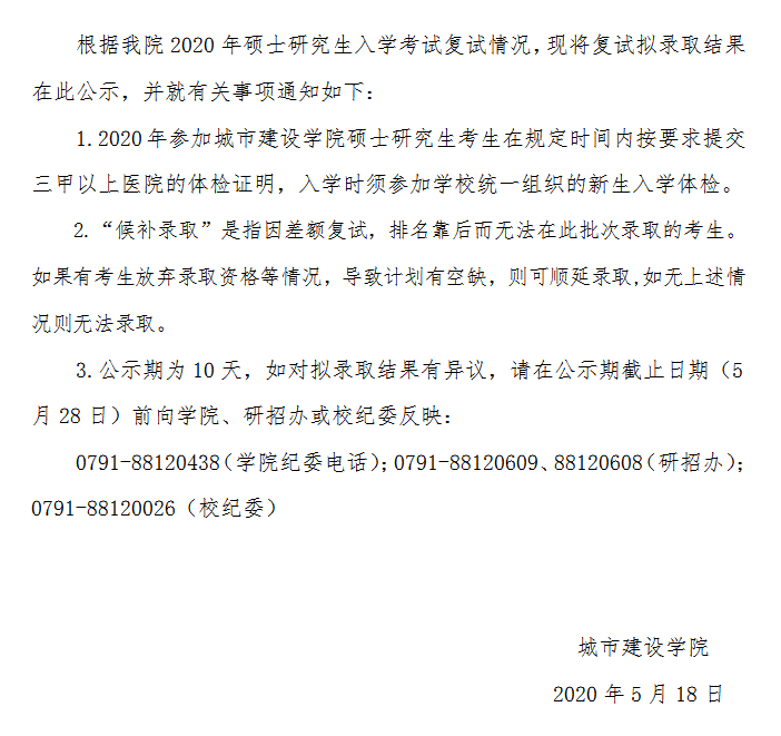 据悉,江西师范大学城市建设学院2020年硕士研究生入学考试复试结果公示已公布,聚创江西师范大学考研网为大家整理如下: