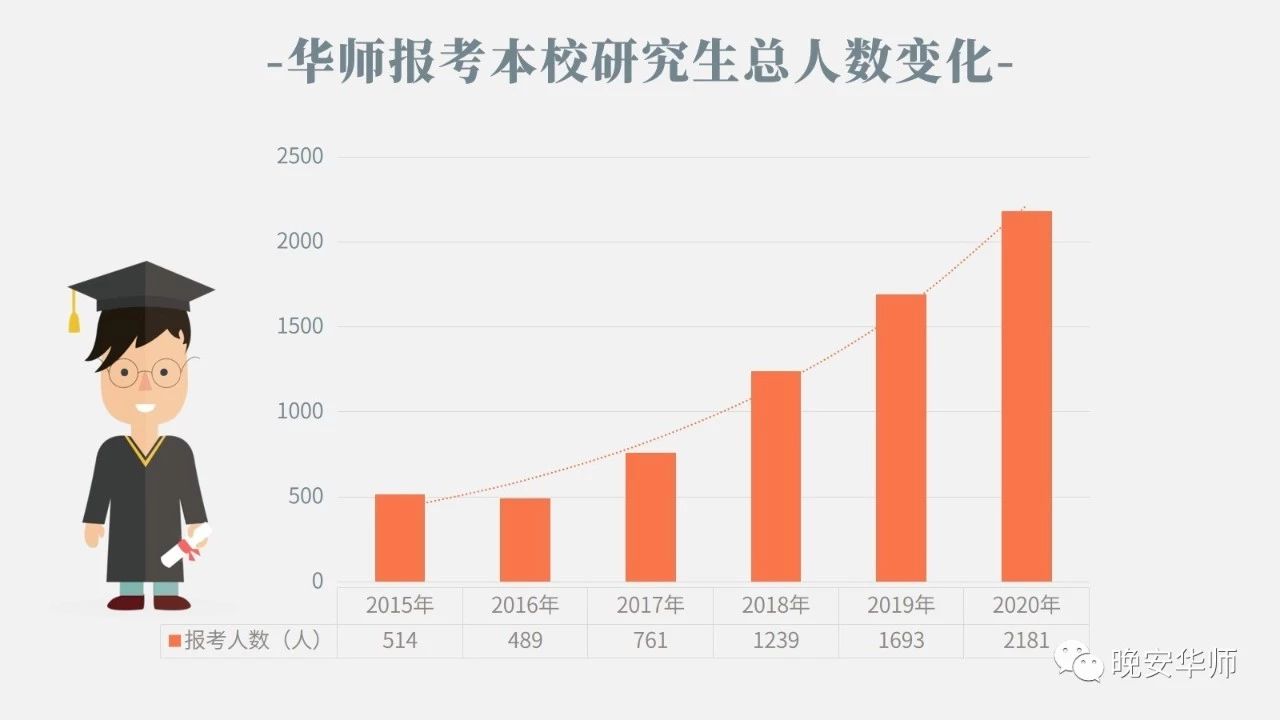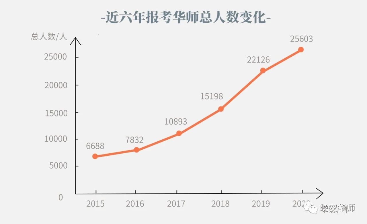 据数据统计,2020年报考华师的总人数25603人,相比2019年的22126人,增加了3477人,同比增长15.71%。此外, 2018年为15198人,2017年为10893人,2016年为7832人,2015年为6688人。
