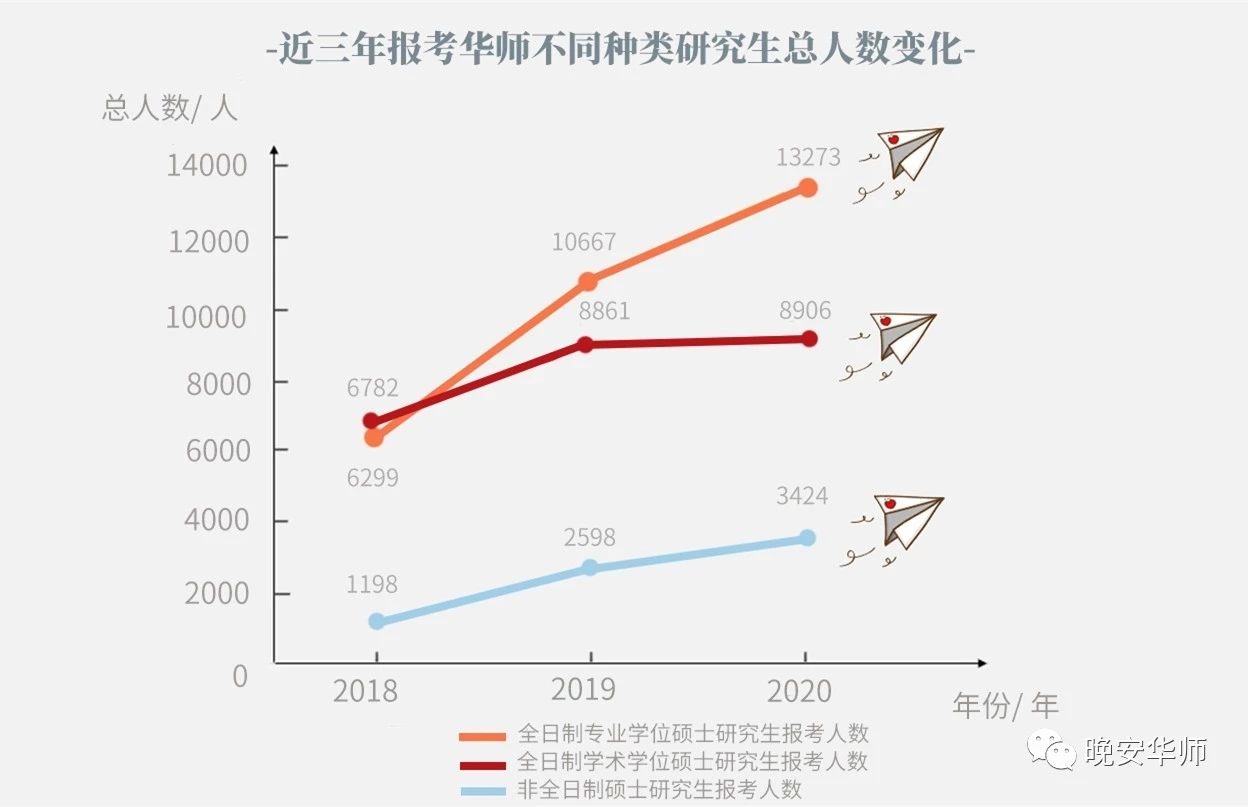 此外,近三年报考华师不同类型研究生人数不断增加。其中,2020年全日制学术学位硕士研究生报考人数为8906人,相比2019年增加了45人,同比增加0.51%。2020年全日制专业学位硕士研究生报考人数为13273人,相比2019年的10667人增加了2606人,增幅达24.43%。2020年非全日制硕士研究生报考人数为3424人,相比2019年的2598人增加了826人,同比增长31.79%。