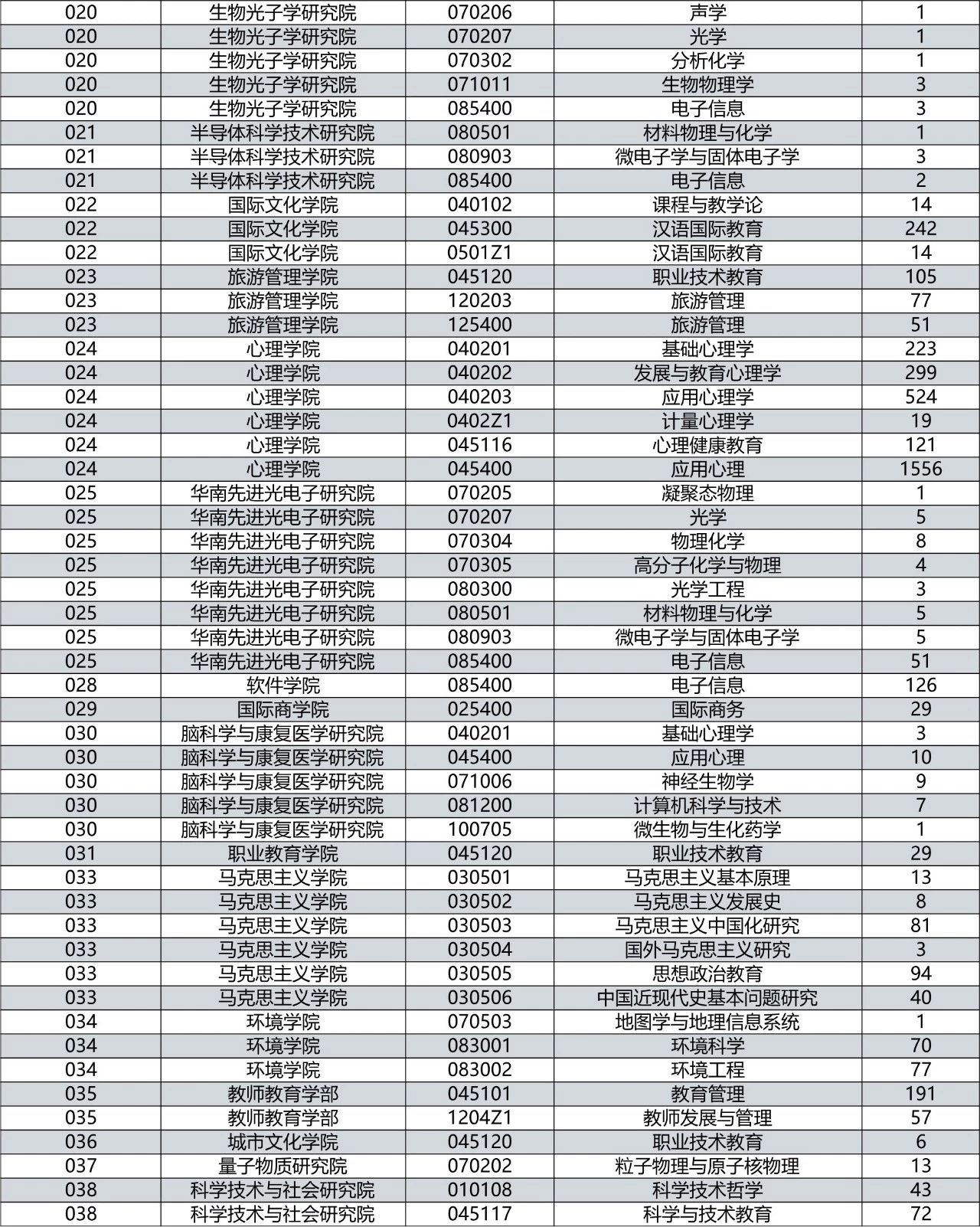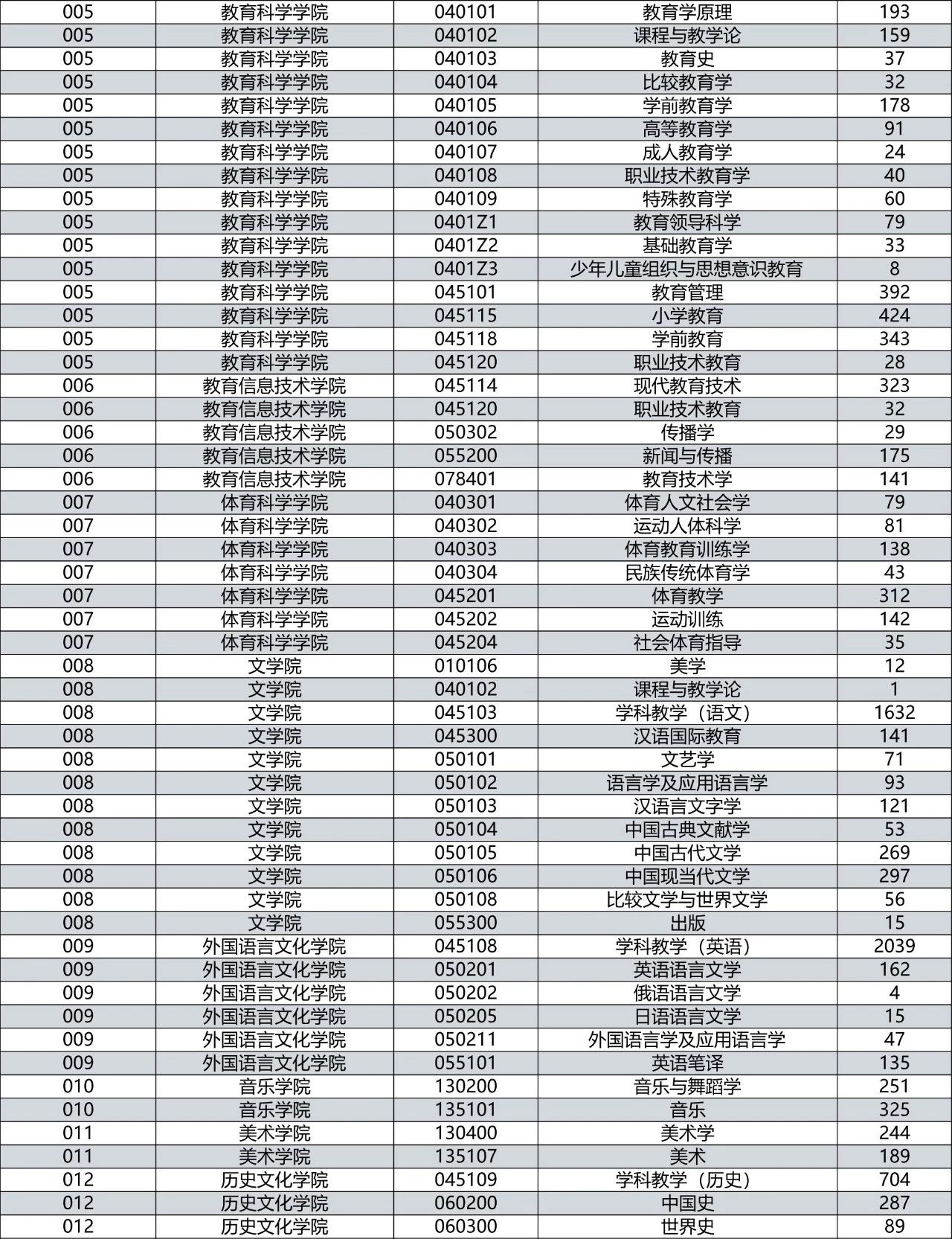 2020年,华师共有206个专业招收研究生。其中,有三个专业报考人数超过1000人:学科教学(英语)报考人数为2039人,学科教学(语文)报考人数为1632人,应用心理报考人数为1556人。有8个专业报考人数超过500人:学科教学(生物)报考人数为732人,学科教学(历史)报考人数为704人,学科教学(数学)报考人数为694人,公共管理报考人数为651人,金融报考人数为539人,会计报考人数为530人,应用心理学报考人数为524人,工商管理报考人数为516人。