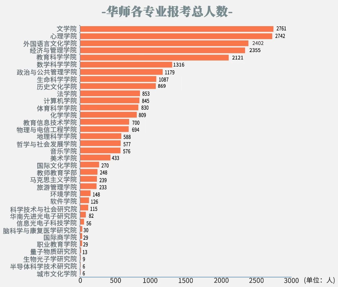 此外,今年华师总共有28个学院、6个研究院和1个学部招生。有5个学院的报考人数超过了2000人,其中,文学院报考人数最多,为2761人;心理学院紧随其后,为2742人;外国语言文化学院排名第三,为2402人;经济与管理学院为2355人,教育科学学院为2121人。