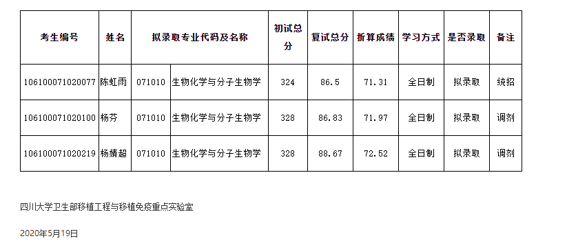 据悉,四川大学卫生部移植工程与移植免疫重点实验室2020年硕士研究生招生拟录取名单公示已公布,聚创四川大学考研网小编为大家整理如下: