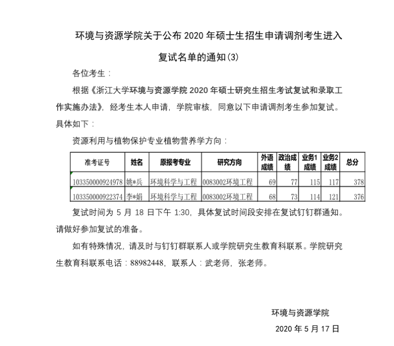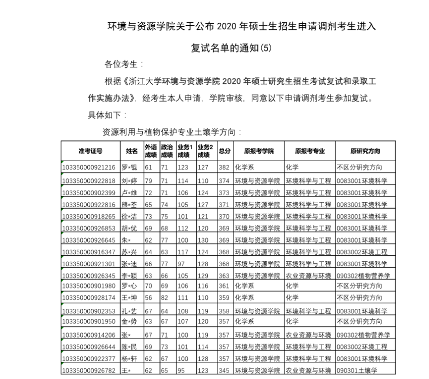 据悉,浙江大学环境与资源学院关于公布2020年硕士生招生申请调剂考生进入复试名单的通知(3)(4)(5)已发布,聚创浙大考研为你整理如下内容: