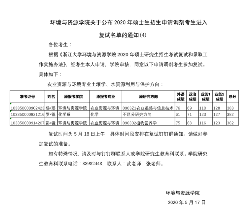 以上是聚创考研网为考生整理的"浙江大学环境与资源学院关于公布2020年硕士生招生申请调剂考生进入复试名单的通知(3)(4)(5)"的相关考研信息,希望对大家考研备考有所帮助!