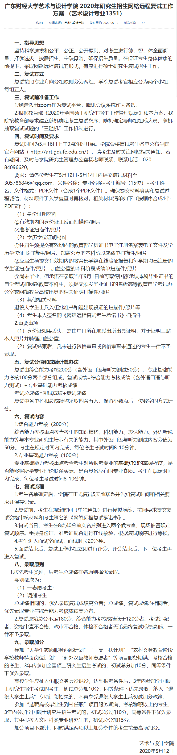 据悉,广东财经大学艺术与设计学院2020年研究生招生网络远程复试工作方案(艺术设计专业1351)已公布,聚创广东财经大学考研网小编为大家整理如下: