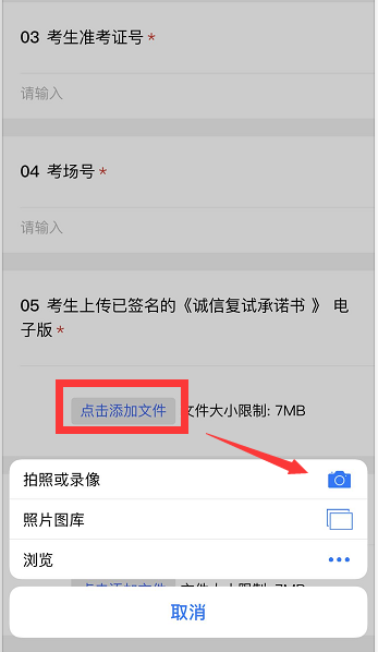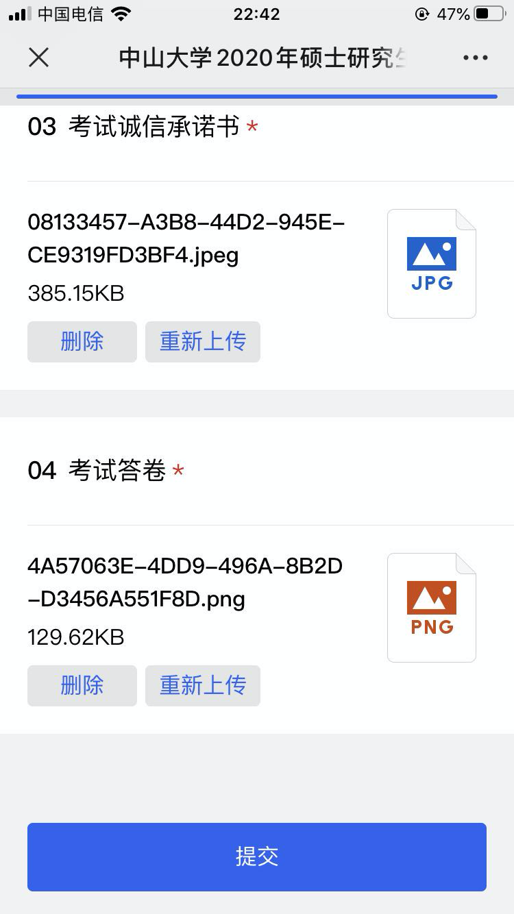 4.笔试结束后,所有考生不得继续作答。考生根据监考员要求,依序举起3张答题纸,由监考员进行截图。然后根据监考员要求,取回辅机位手机或平板电脑,登录与本院工作人员联系的微信号,扫描监考员通过腾讯会议发布的二维码,进入答卷提交系统,填写相关信息并完成承诺书及答卷的拍照和上传(通过即时“拍照”上传,每页答卷单独拍照,单独上传),上传完毕后点击【提交】完成考卷上交。全程必须保持主机位仍处于开启状态,且考生一直处在主机位的视频画面中。