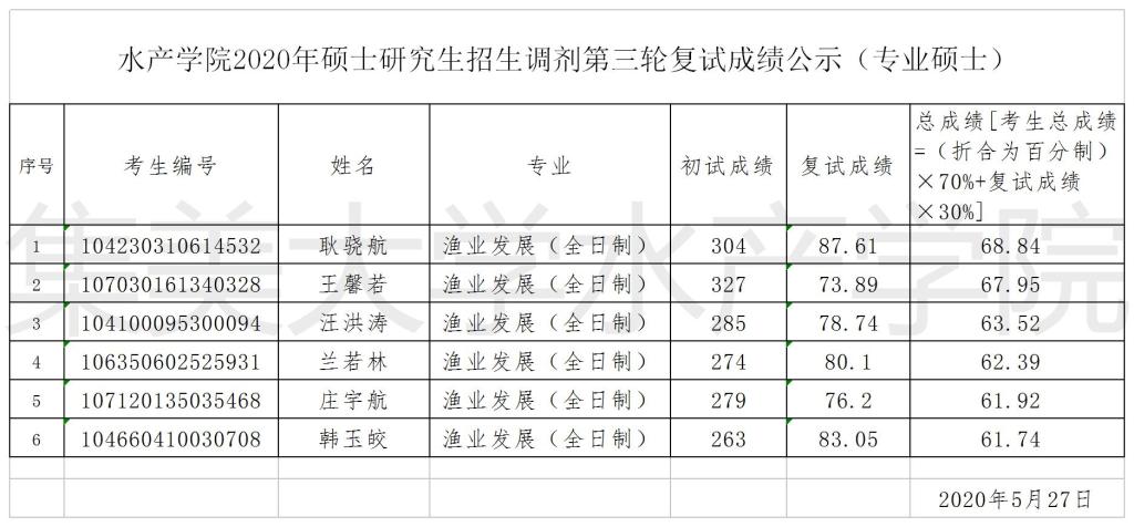 以上是聚创考研网为考生整理的"集美大学水产学院2020年硕士研究生招生调剂第三轮复试成绩公示(专业硕士)"的相关考研信息,希望对大家考研备考有所帮助!